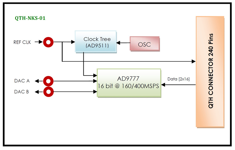 • 2 Channels, 16-bit Resolution I/Q, 160/400 MSPS DAC Converter • 3.3V Analog Supply Operation and 3.3V Output Supply • SFDR = 80 dBFS @ 10 MHz & 20 MHz Bandwidth • Programmable Channel Gain Over 1 dB Range in 0.01 dB Increment and Offset Adjustment • Serial Port Control: Programmable Clock and Data Alignment • On-chip 1.2 V Reference • Internal PLL Clock Multiplier & Selectable Internal Clock Divider • Versatile Clock Input • Selectable 2×/4×/8× Interpolating Filter • fs/4, fs/8 Digital Quadrature Modulation Capability • Dual-port or Single-port Interleaved Input Data • Dual Differential Current Output (Iout=±20mA) Terminated to 50 Ohm • A SAMTEC Interface Connector for Digital Output, Power LEDs and MCX Connector for AOUT & EXTCLK • Phase Matched Clocking ( On-board a Clock Distributer) • On-board 160MHZ Ultra Low Phase Noise TCXO • Physical Dimensions (L: 120.7 mm, W: 92.2 mm) • Industrial Temperature Range (-40°C to 85°C) |