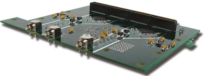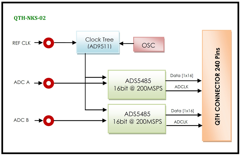 • Dual 16 bit, 200 MSPS Analog to Digital Converters • SFDR = 91dBFS • ENOB=12.2 bits • Analog Input Filter Options • Efficient DDR LVDS-Compatible Outputs • Flexible Analog Input: 1V p-p to 3V p-p Range • Serial Port Control: Programmable Clock and Data Alignment • 3.3V and 5V Analog Supply Operation • Xtalk Isolation >100 dB • High Performance AC-Coupled Analog Input • On-board a Clock Distributer • Differential Input with 700MHz Bandwidth • On-board 200MHZ Ultra Low Phase Noise Crystal Oscillator • A SAMTEC Interface Connector for Digital Output, Power LEDs and Single-ended MCX Connector for AIN & EXTCLK • On-chip Voltage Reference • Data Output Clock and Clock Duty Cycle Stabilizer • Input Power: 5V QSH Connector or External Voltage Supply • Physical Dimensions (L: 4.75 in, W: 3.63 in) • Pin Compatible with ADS5483/5482/5481, 135/105/80-MSPS ADCs • Industrial Temperature Range (-40°C to 85°C)