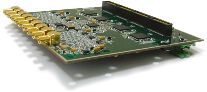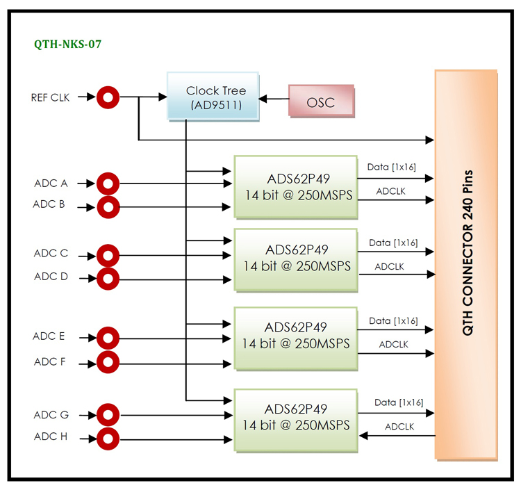 • 8 Channels, 14-bit Resolution, 125MSPS ADC Converters • SNR = 73 dBFS @ 70 MHz and 125 MSPS • SFDR = 86 dBc @ 70 MHz and 125 MSPS • ENOB = 11.6 Bits @ 70 MHz and 125 MSPS • Analog Input Filter Options • Efficient Parallel CMOS & DDR LVDS-Compatible Outputs • Flexible Analog Input: 2V p-p Range • Serial Port Control: Programmable Clock and Data Alignment • 3.3V Analog Supply Operation • Xtalk Isolation >91 dB • High Performance DC-Coupled Analog Input • On-board a Clock Distributer • Differential Input with 450 MHz Bandwidth • On-board 125 MHZ Ultra Low Phase Noise Crystal Oscillator • QTH Interface Connector for Digital Output, Power LEDs and Single-ended MCX Connector for AIN & EXTCLK • Direct ADC Connection to Host FPGA Ensures • Maximum Throughput • Physical Dimensions (L: 107.7 mm, W: 92.2 mm) • Pin Compatible with ADS62P42/43/44/45, 65/80/105/125MSPS ADCs • Industrial Temperature Range (-40°C to 85°C) |