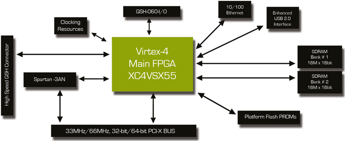 • Xilinx DSP-Grade XC4VSX55/XC4VLX100/XC4VLX160 FPGA • CI/PCI-X: 64-bit 66MHz/32-bit 33MHz PCI Add-in Card Connector • Ethernet: Enhanced 10/100 Ethernet Full Stack Interface with RJ-45 Connector • LVDS: 2 SAMTEC LVDS interface Connectors with up to 40 and 80 High-Speed Channels each • Xilinx SP3-AN for PCI-based and User I/O • Device Configuration Through On-board Platform Flash (32Mb), or Download Using Xilinx Platform Cable USB (JTAG programming interface) • Two Independent SDRAM Banks (up to 64MB) • User Push-button, Switches, LEDs and General Purpose I/O Header (GPIO Header) • JTAG and Trace Debug Ports • USB: Enhanced High - Speed USB 2.0 Interface • PCI Clocking Support for Global and Regional Clocking Applications • Four On-board Clock Sources • SPI EEPROM (32Mb) • Input Power: 5/12V PCI & External Voltage Supply • On-board Power Regulators (5V, 3.3V, 2.5V, 1.8V,1.2V) • Operation System Support: Windows