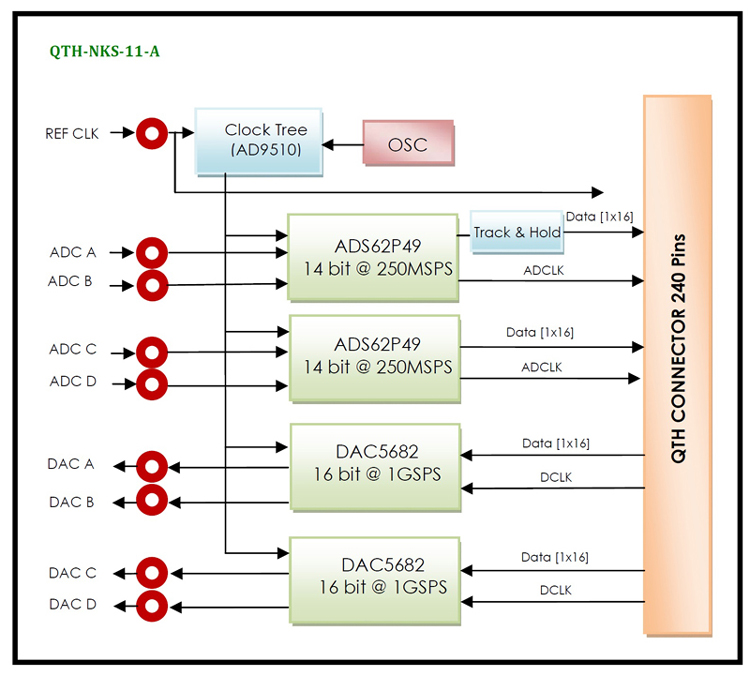 Other's: • Serial Port Control: Programmable Clock and Data Alignment • On-board Clock Distributer • QTH Interface Connector for Digital Input Output, Power LEDs and Single-ended MCX Connector for AIN, AOUT& EXTCLK • Direct ADC/DAC Connection to Host FPGA Ensures • Maximum Throughput • Physical Dimensions (L: 117.9 mm, W: 97 mm) • Industrial Temperature Range (-40°C to 85°C)