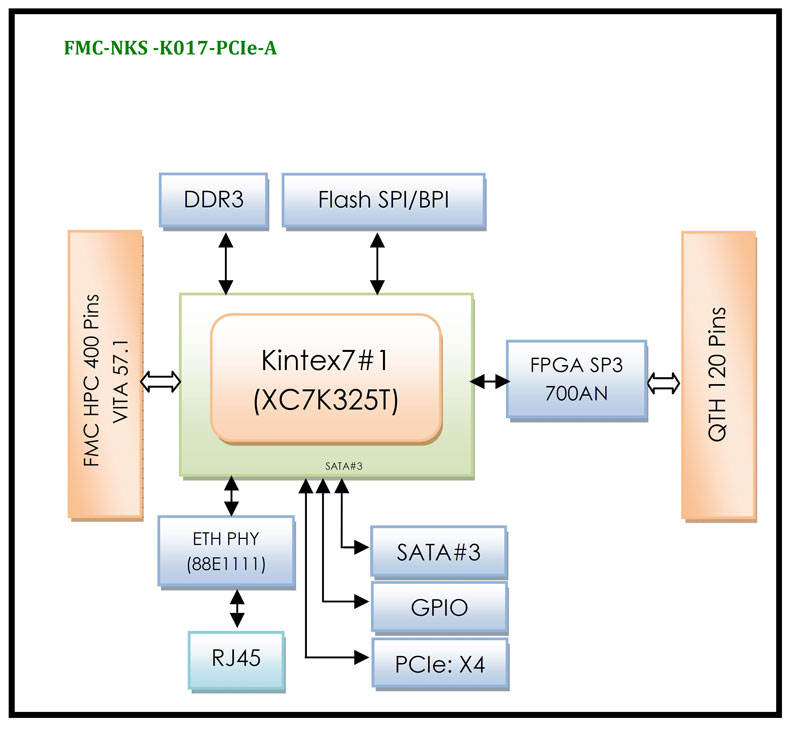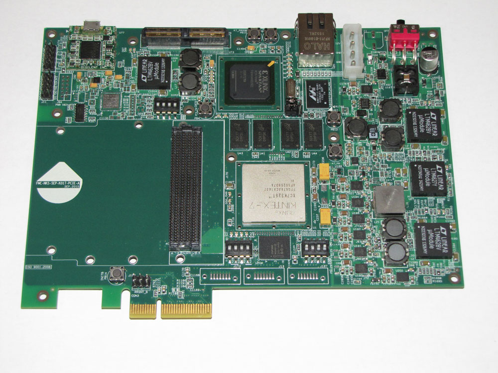 • Kintex-7 XC7K325T-2FFG676I Xilinx Device Compatible with 410T, 160T and 70T Kintex-7 Family • Spartan-3 XC3S700AN Xilinx Device • 3x SATA ii, iii • PCI Express x4 Edge Connector • FMC HPC for ADC/DAC FMC Modules Connect to FPGA • QTH Connector Connect to FPGA Spartan-3 • 8 Gb DDR3 Component Memory • Ethernet PHY 10/100/1000 Interface with RJ-45 Connector • USB JTAG Module • User Push-button, Switches, LEDs • Multi-boot Configuration • Power on/off Slide Switch • 12V PCIe HDD Connector or External Voltage Supply • Physical Dimensions (L: 185 mm, W: 135 mm) • Industrial Temperature Range (-40°C to 85°C) • Operation System Support: Windows & Linux |